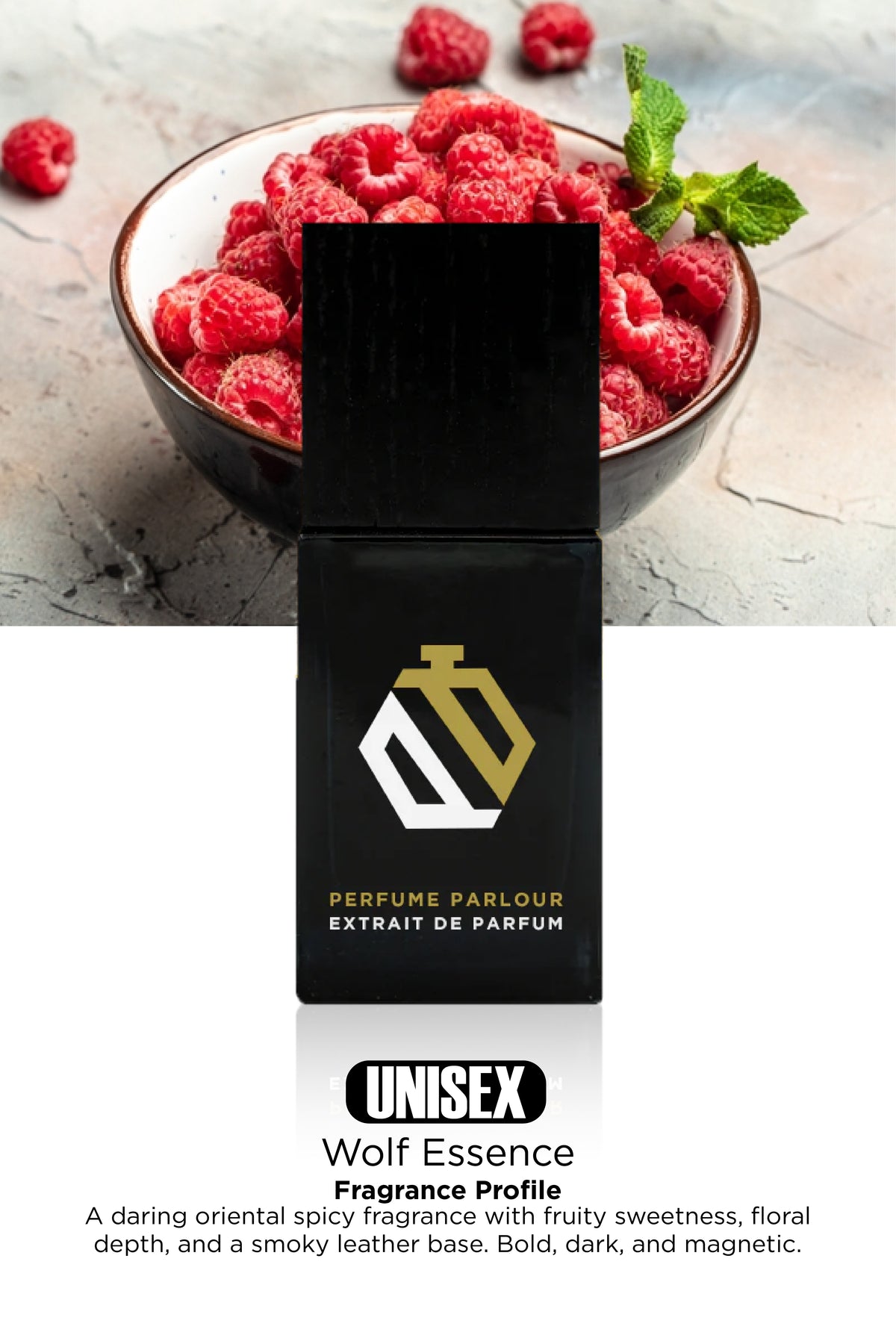 Wolf Essence is a powerful unisex fragrance that embodies strength and mystery. It opens with juicy raspberry, crisp apple, exotic saffron, and spicy cardamom, setting a vibrant and commanding tone. The heart reveals a refined floral bouquet of lily of the valley, white flowers, violet, and cinnamon, adding warmth and elegance. Finally, the base settles into smoky leather, sensual musk, rich woods, and amber, leaving behind a long-lasting and unforgettable trail.